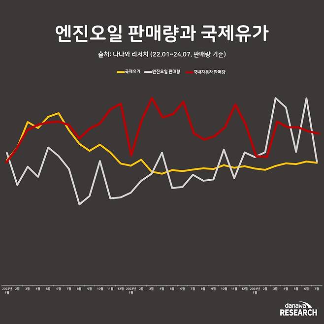 엔진오일 판매량은 국제유가보다는 국내 자동차 판매량과 더 밀접한 상관관계를 보였으며, 자동차 판매량이 증가할 때 함께 상승하는 경향이 뚜렷했다. 그러나 2024년 들어서는 자동차 판매량이 주춤한 반면, 엔진오일 판매량은 크게 상승하는 양상이 나타났다. 이제는 엔진오일 수요가 차량 판매량에만 의존하지 않음을 시사한다.