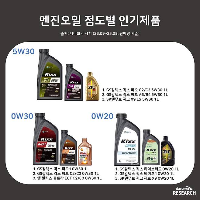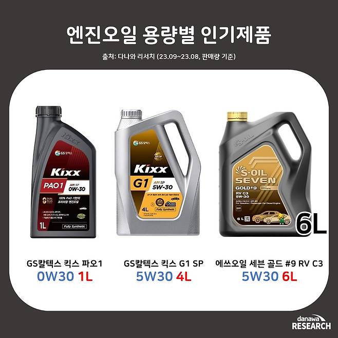 엔진오일 용량별로 인기 있는 제품은 1L GS칼텍스 킥스 파오1 (0W30), 4L GS칼텍스 킥스 G1 SP (5W30), 6L 에쓰오일 세븐 골드 #9 RV C3 (5W30)으로 나타났다.