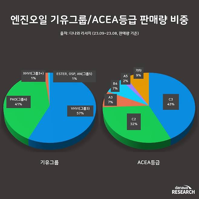 등급이 높을수록 성능이 좋다고 표현할 수 있으며, 시중에 판매되는 대부분의 엔진오일은 그룹 3(VHVI) 이상의 합성유로 만들어진다. 기유 그룹별 판매 비중은 그룹 3 가 57%로 가장 높은 비중을 차지하고 있으며, 성능 면에서 균형이 잡혀 있어 많은 소비자들이 선택하는 제품군이다. 이어서 그룹 4가 41%로 2위를 기록하며, 뛰어난 성능과 내구성을 제공해 고성능 차량이나 극한 운전 환경에 적합하다.