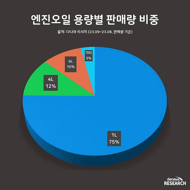 대부분의 소비자들은 소량 단위로 엔진오일을 구매하고 있다. 지난 1년간 가장 많이 판매된 엔진오일 용량은 1L로, 전체 판매의 75%를 차지했다. 1L 단위의 엔진오일은 고용량 제품에 비해 종류가 다양해 선택의 폭이 넓은 점도 요인으로 추측된다. 또한, 엔진오일 교체 후 남은 오일을 보관할 때 1L 단위가 더 효율적인 부분도 있다.