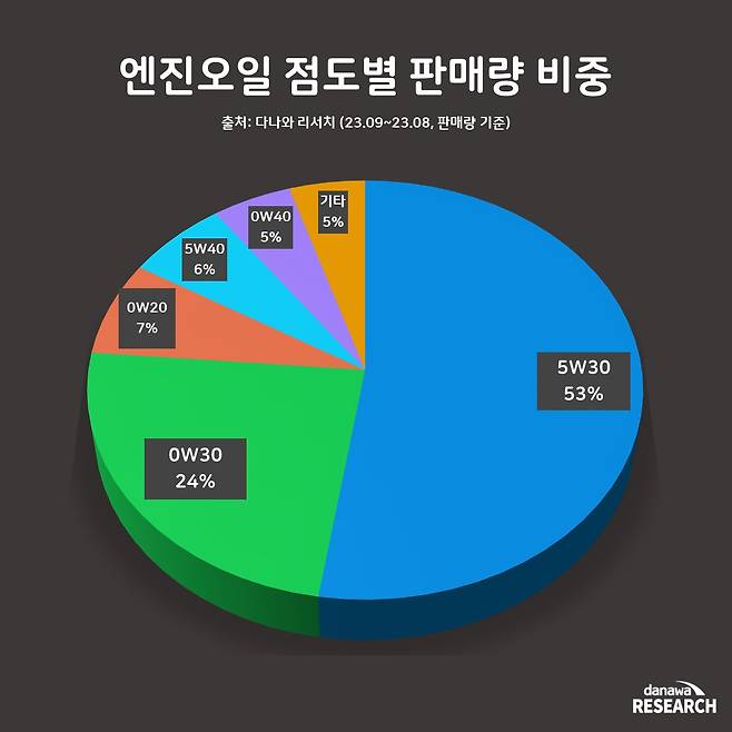 지난 1년간의 판매 데이터를 보면, 5W30이 전체 판매의 53%를 차지하며 가장 많이 판매되었고, 0W30이 24%의 비중으로 2위를 기록했다. 그다음으로 0W20, 5W40, 0W40 순으로 판매되었다.