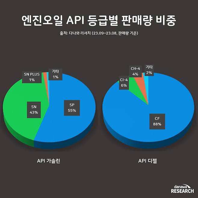 디젤등급은 CF 등급이 88%로 가장 높은 비중을 차지했다. 디젤 엔진을 사용하는 구형 엔진에서 안정적으로 사용 가능한 등급으로 많은 디젤 차량에서 사용 중이다. 이어서 고성능 디젤 엔진이나 최신 디젤 차량에서 사용되는 CI-4, CH-4 등급이 각각 6%, 4%의 비중을 차지했다.
