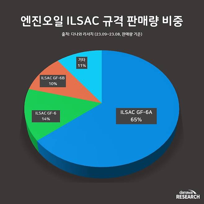 많은 소비자들이 최신 규격을 선호하고 있었다. 최근 1년간 ILSAC 규격별 엔진오일 판매량을 살펴보면 ILSAC GF-6A 규격이 전체 판매량의 65%로, 가장 높은 비중을 차지한다. GF-6A는 최신 차량에 적합하며, 엔진 보호와 연비 효율을 동시에 고려한 규격이다. 이어서 ILSAC GF-6 규격이 14%의 비중을 차지했다. 해당 규격 또한 최신 차량에서 사용되고 있으며 엔진 성능 향상에 기여하는 등급이다.