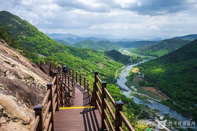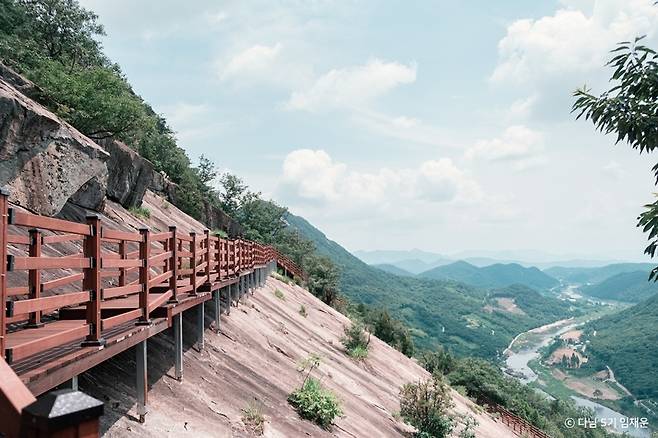데크가 절벽을 따라 휘어지며 이어질 때마다 강물의 곡선이 빛을 머금고 반짝입니다. 멀리 보이는 용여암과 기암괴석, 그리고 구름이 걸린 산 능선은 그 자체로 한 폭의 동양화 같은 풍경을 만들어냅니다.