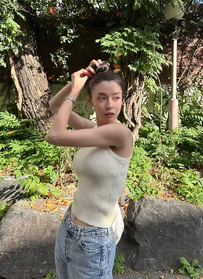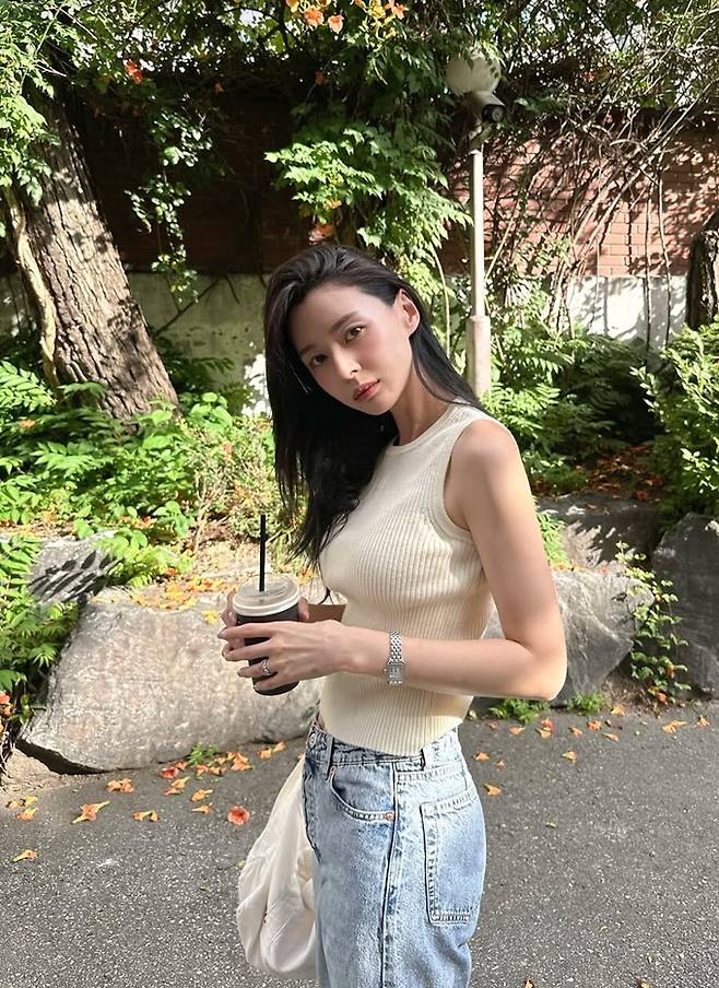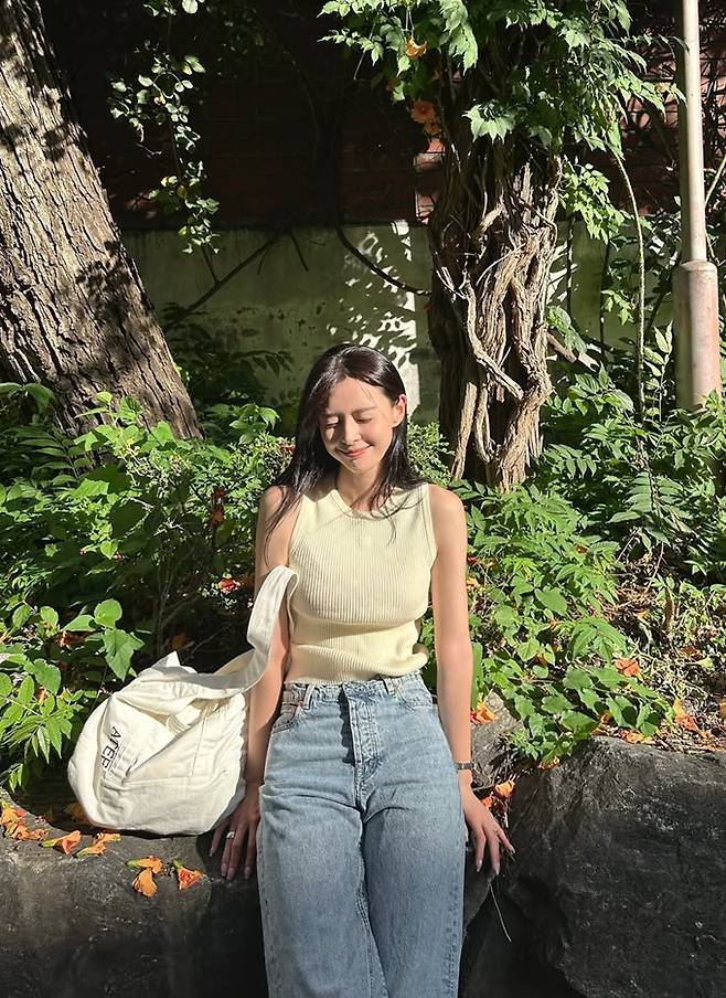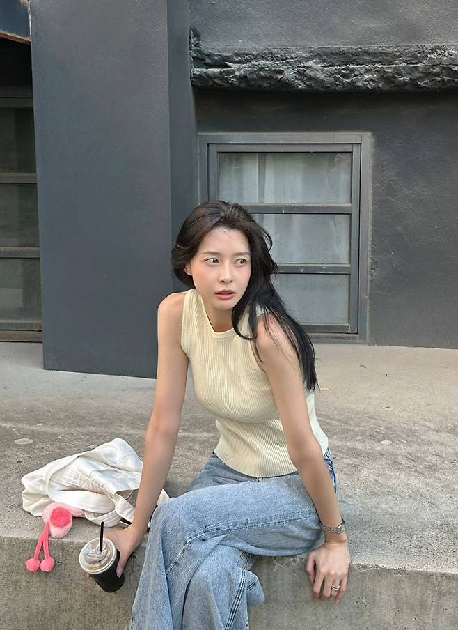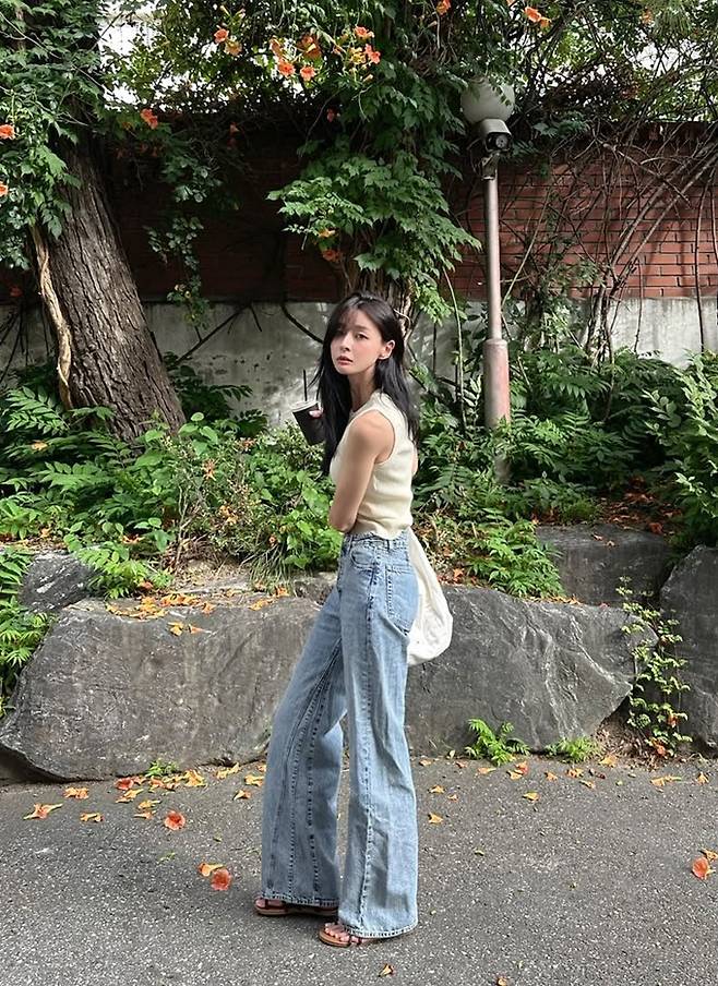 공개한 사진에서 권나라는 베이지 컬러 민소매 니트 톱에 연청 와이드 진을 매치한 산책룩으로 한여름에도 시원하고 청량한 무드의 여름 스타일링으로 자연스러운 매력을 한껏 드러냈다.