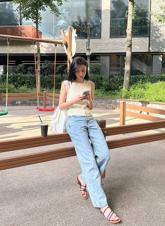 배우 권나라가 니트와 데님 산책룩으로 여름 스타일링의 정석을 선보였다.