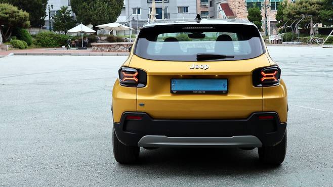 전면보다는 뒤에서 볼 때 체구가 더욱 작아 보인다. SUV 치고 전고가 정말 낮은 편인데, 전폭까지 좁다. 그만큼 개성적이고 귀여운 디자인으로 받아들일 수 있는 여지가 있다. 특히 테일램프는 '제리 캔'을 형상화한 독특한 그래픽으로 지프만의 헤리티지를 자극했다. 직선 위주의 디자인 마감이나 두꺼운 언더 플레이트, 그리고 전기차를 암시하는 'e' 형태의 엠블럼이 부착된다. 그 밖에도 어벤저 EV에는 자연과 모험, 브랜드를 형상화하는 다양한 '이스터에그' 패턴이 적용되어 있어 디자인에 대한 더욱 강한 흥미를 품게 만든다.