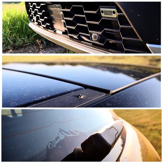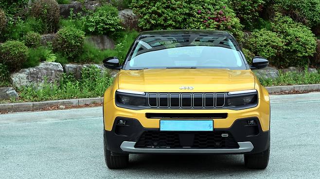 시승 차량은 지프 어벤저 EV Altitude 등급이다. 국내 시판 차량 기준으로는 상위 트림에 해당된다. 전면 디자인에서의 차이는 프로젝션 타입 LED 헤드램프가 적용된다는 점, 헤드램프 자체는 DRL과 메인 모듈이 분리된 형태를 갖춘다. DRL을 높게 배치해서 차량 전고를 강조하는 부분은 지프의 공통된 패밀리룩 중 하나라 볼 수 있다. 7대륙을 상징하는 7슬롯 그릴도 언급하지 않을 수 없다. 전기차인만큼 그릴 표면은 막혀있지만, 그만큼 더욱 지프의 아이덴티티를 나타내는 가장 확실한 요소 중 하나가 된다. 넓은 면적의 언더커버 또한 전통적인 SUV의 감성을 연출해 준다.