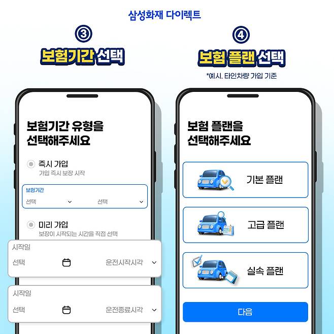 삼성화재 다이렉트는 원하는 기간을 선택해 가입할 수 있습니다.6시간부터 최대 10일까지, 필요한 만큼만 가입하세요!(*1시간 단위로 가입 가능)