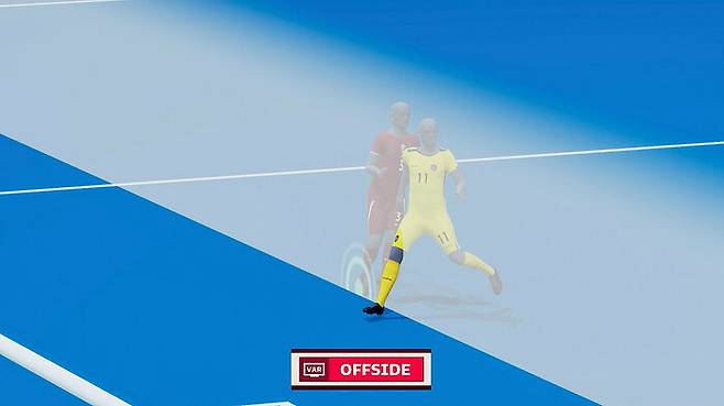 맨눈으로는 오프사이드 여부를 확인하기가 어려웠으나, 이내 경기장 전광판에 떠오른 반자동 시스템이 화면을 잡아냈습니다.