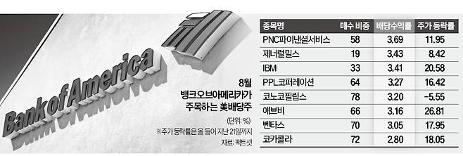 BoA는 PNC파이낸셜서비스, 제너럴밀스, IBM, PPL코퍼레이션, 코노코필립스, 애브비, 벤타스, 코카콜라 등을 투자 매력이 높은 배당주로 꼽았다. 금리 인하에도 안정적인 배당 수익을 얻을 뿐 아니라 향후 주가 상승 여력도 충분하다는 이유에서다.
