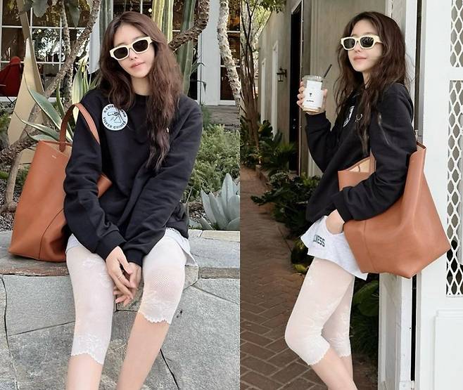 오버사이즈 블랙 스웨트셔츠와 선글라스, 그리고 브라운 토트백으로 마무리한 이지아는 캐주얼하면서도 독특한 스타일을 연출했습니다.