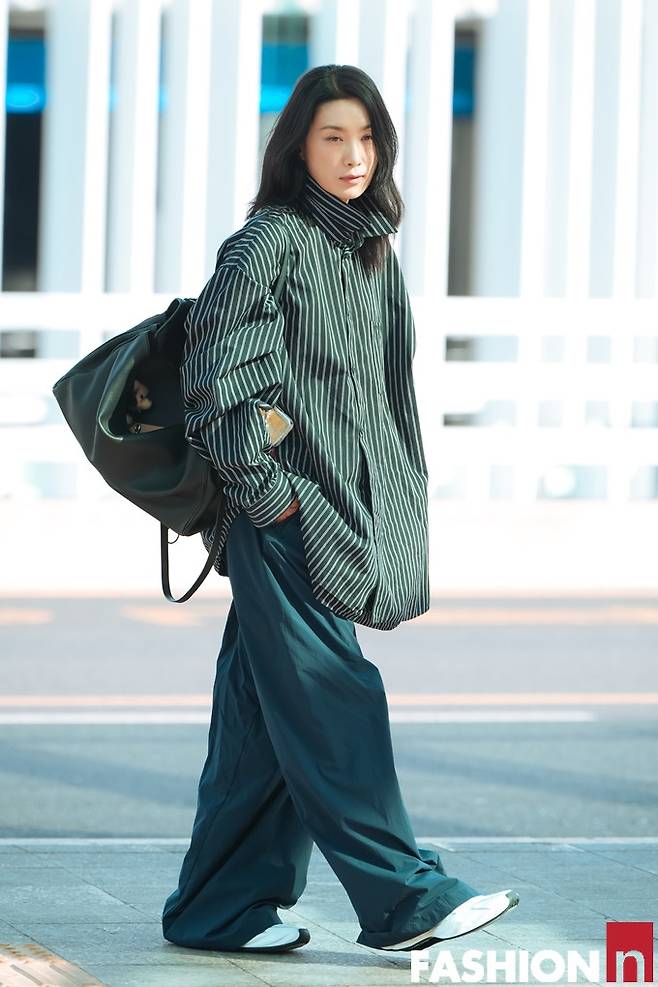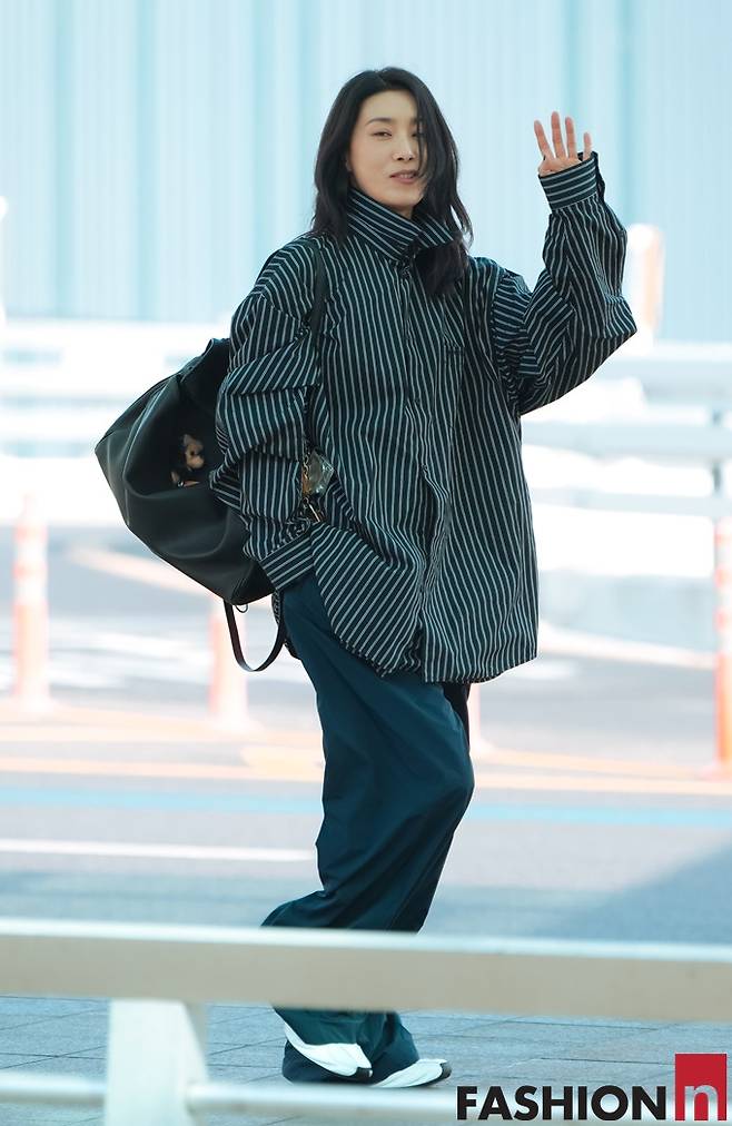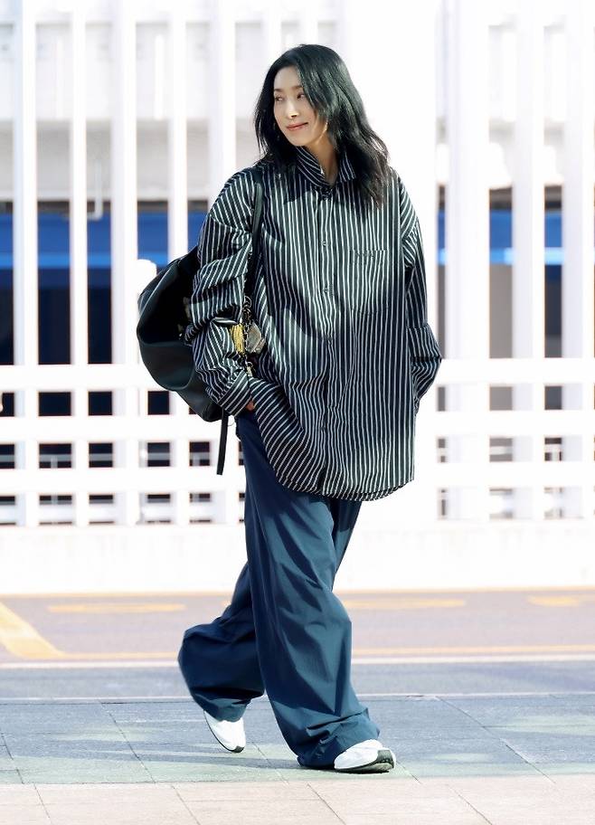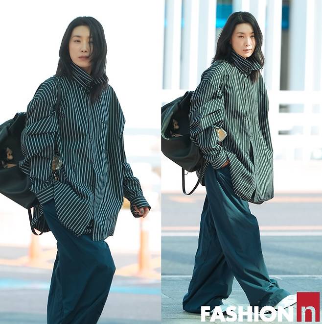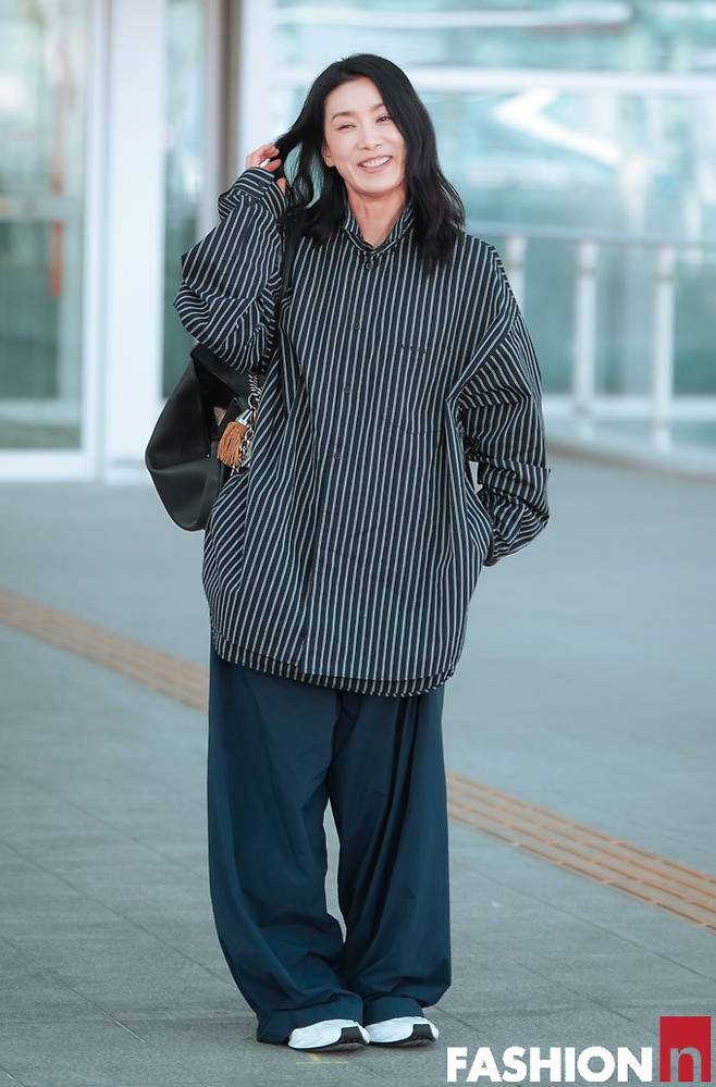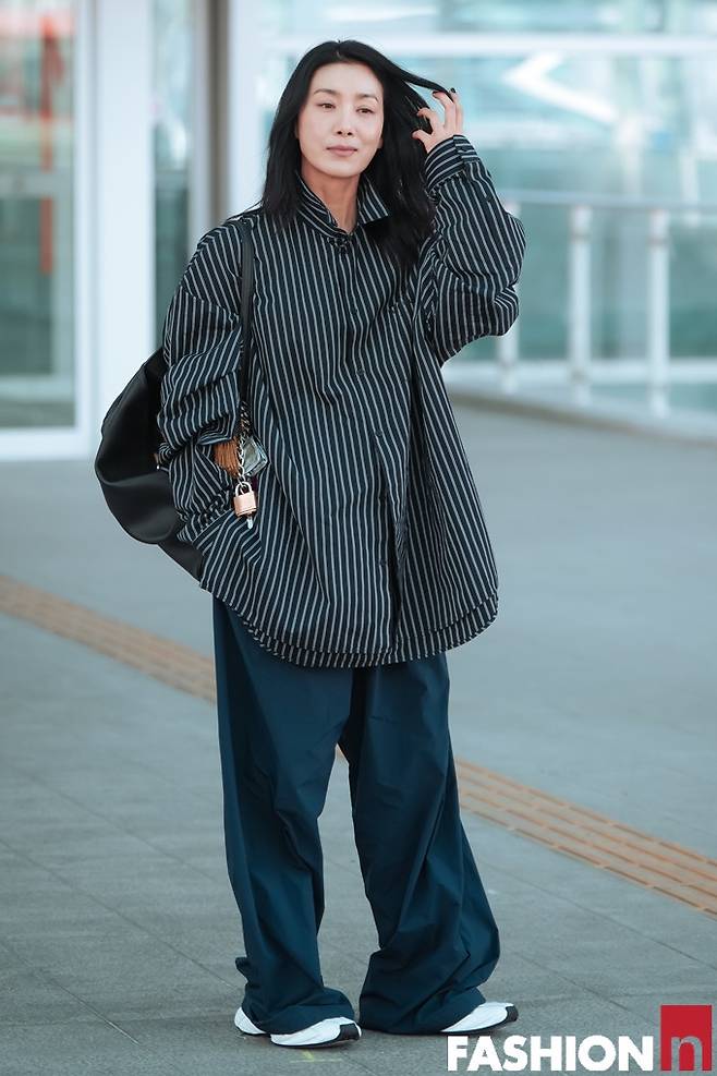 이날 김서형은 스트라이프 디테일이 돋보이는 네이비 컬러의 오버 사이즈 셔츠와 트랙 팬츠를 입고 51세 나이가 믿기지 않은 힙하면서도 스타일리시한 출국룩을 선보였다.