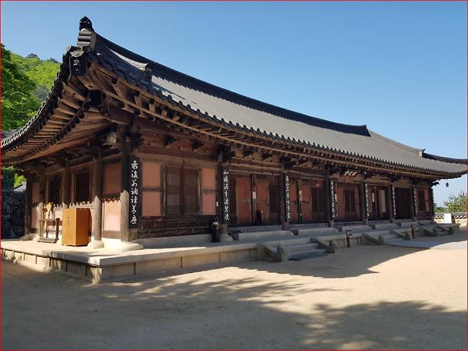 축서사로 향하는 길은 일주문을 지나서도 한참을 더 올라가야 비로소 그 모습을 드러냅니다. 넉넉한 주차장에 차를 세우고 시원한 반야수로 목을 축인 뒤 마주하게 되는 첫 관문은 2층 누각 형식의 ‘보탑성전’입니다. 이곳은 단순한 출입구를 넘어 속세와 불법의 세계를 나누는 상징적인 경계의 공간입니다.