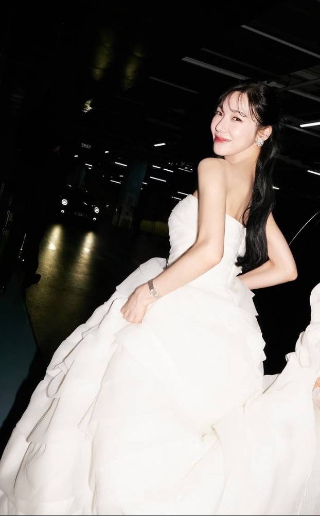 티파니는 클래식하면서도 우아한 화이트 드레스를 선택했습니다. 볼륨감 있는 레이어드 디자인이 특징으로, 풍성한 실루엣이 강조된 드레스로 고급스러움을 극대화했습니다.