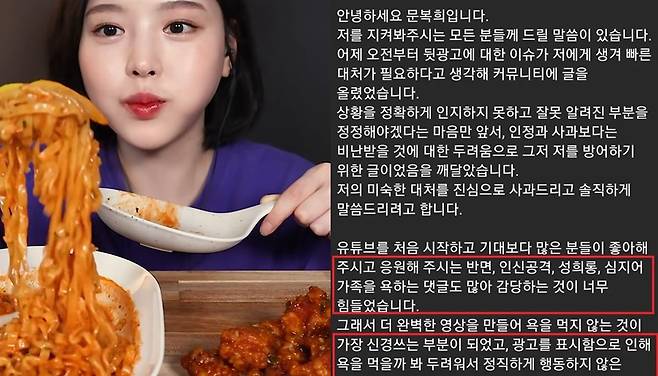 그는 '광고가 들어올 때마다 광고임을 밝혔으나, 잘 보이지 않는 더보기 란에는 고의적으로 하단에 유료 광고를 표기하여 시청자들을 기만한 점을 인정한다'며 반성의 태도를 보였습니다.
