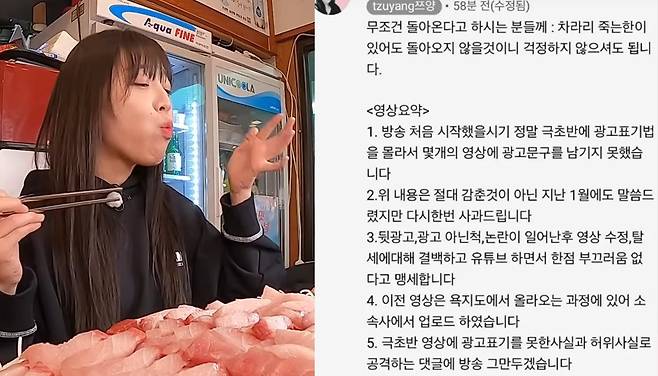 쯔양은 논란 이후 '모든 광고를 철저하게 표시해 왔지만. 과거 광고임을 표시하지 않은 광고 영상이 있는 건 사실'이라고 인정하며 재발 방지를 약속했는데요.