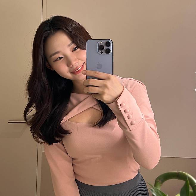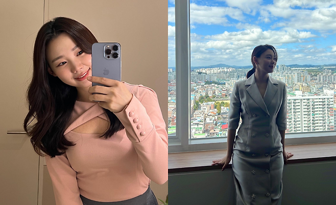 두 번째 사진에서는 핑크 톱과 그레이 플리츠 스커트를 매치해 여성스러운 매력을 강조했다. 상의의 독특한 컷아웃 디테일과 소매 버튼 장식은 포인트 요소로 작용하며, 전체적으로 부드럽고 고급스러운 이미지를 완성한다. 자연스러운 웨이브 헤어와 조화롭게 어우러져 우아함을 더했다.