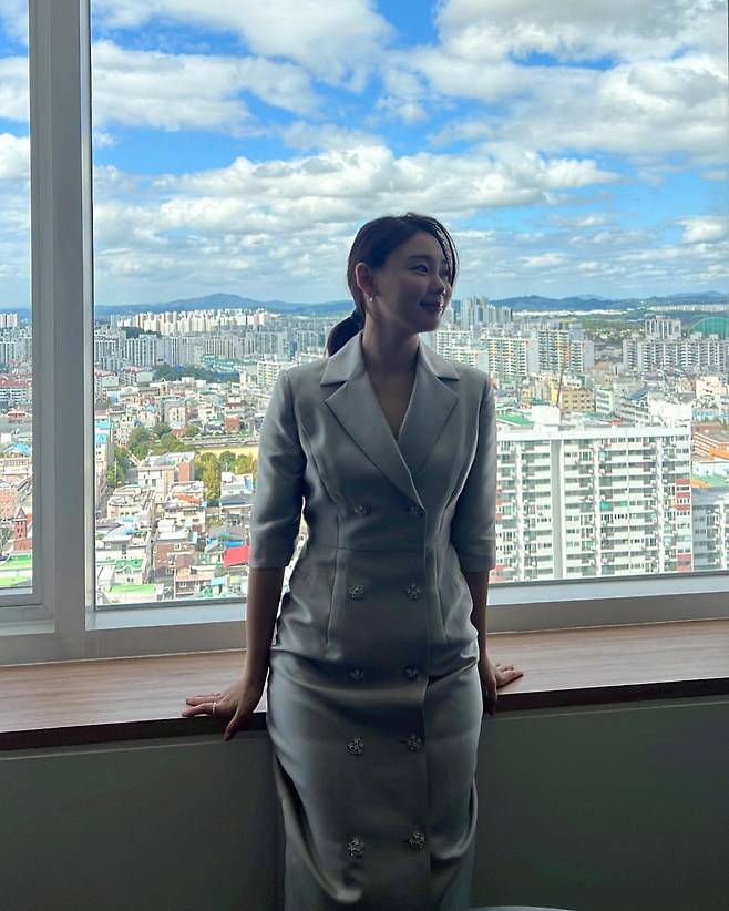 그레이 컬러의 더블 버튼 드레스를 착용해 도시적이고 세련된 이미지를 연출했다. 드레스에 장식된 버튼 디테일은 화려함을 더하며, 허리를 강조하는 실루엣이 우아함을 극대화한다. 대형 창문 너머 펼쳐진 도시 풍경과 어우러져 현대적인 분위기를 완성했다.