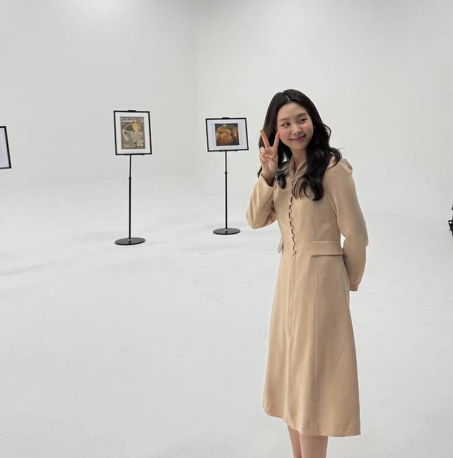 마지막 사진에서 김수민은 단정하면서도 우아한 베이지 롱 드레스를 선택했다. 버튼 디테일과 허리 라인을 강조하는 디자인은 클래식한 매력을 더하며, 깔끔한 실루엣이 돋보인다. 심플한 배경과 어우러져 차분하면서도 세련된 분위기를 연출하고 있다.