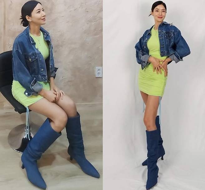 여기에 짧은 크롭 데님 재킷을 매치해 캐주얼한 감성을 더했으며, 슬림한 실루엣을 강조했습니다.