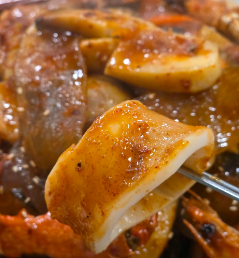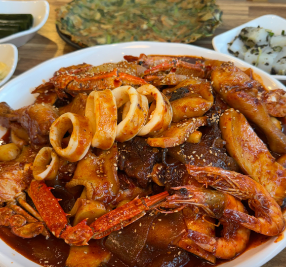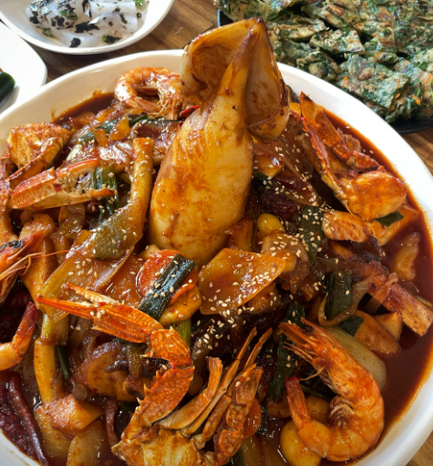새우, 꽃게, 오징어, 가리비, 소라 등 다양한 해물이 함께 들어가 갈비와 해물을 동시에 즐길 수 있습니다. 양념은 단짠 매콤한 스타일이라 밥과 함께 먹기 좋고 술안주로도 잘 어울립니다.