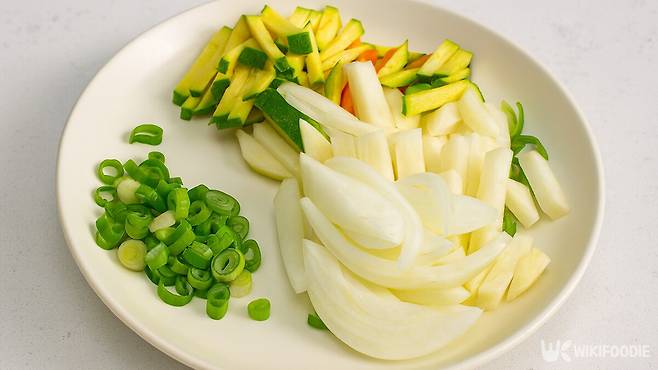 2. 양파, 감자, 애호박, 당근을 얇게 채 썬다. 대파와 청양고추는 송송 썬다.