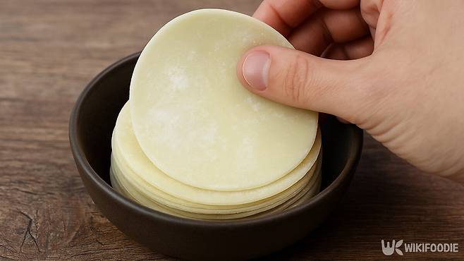 6. 만두피를 물에 적셔 한 장씩 떼어 원하는 크기로 넣는다.
