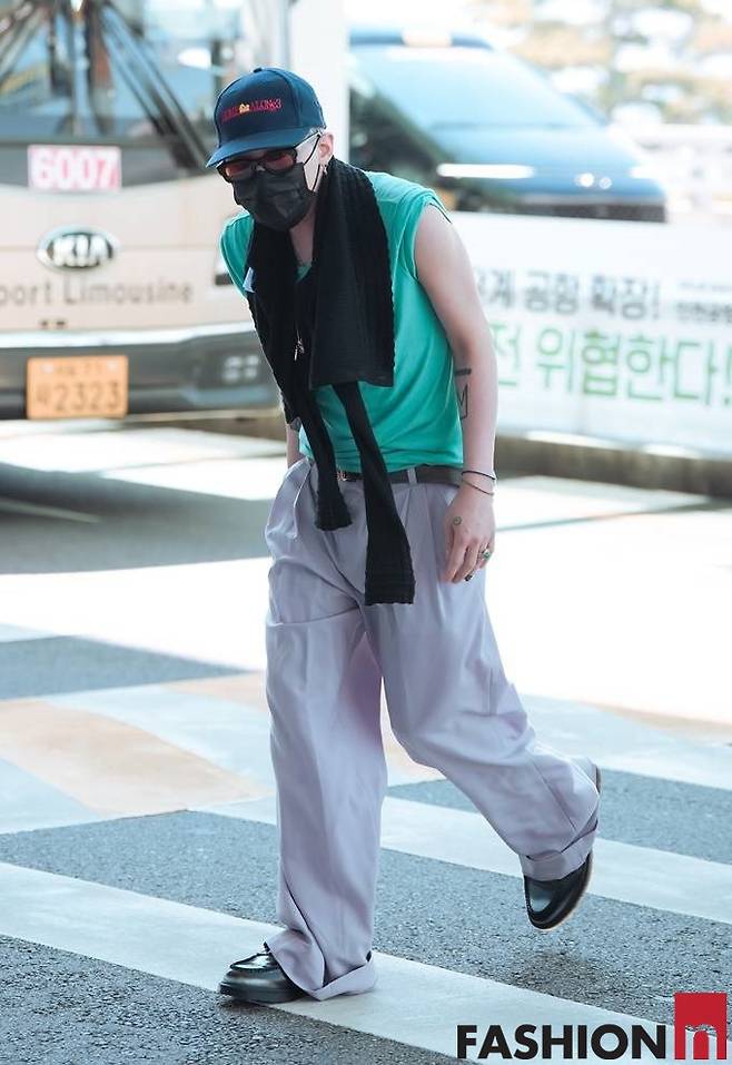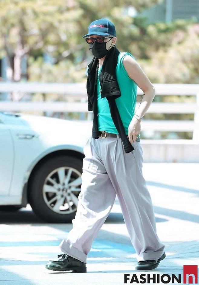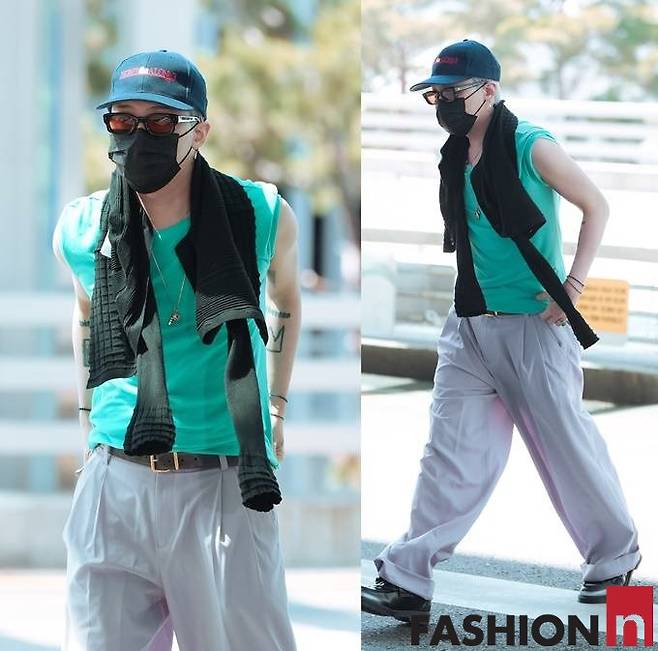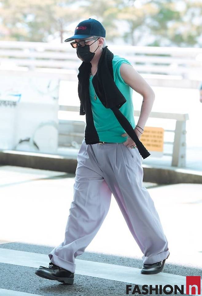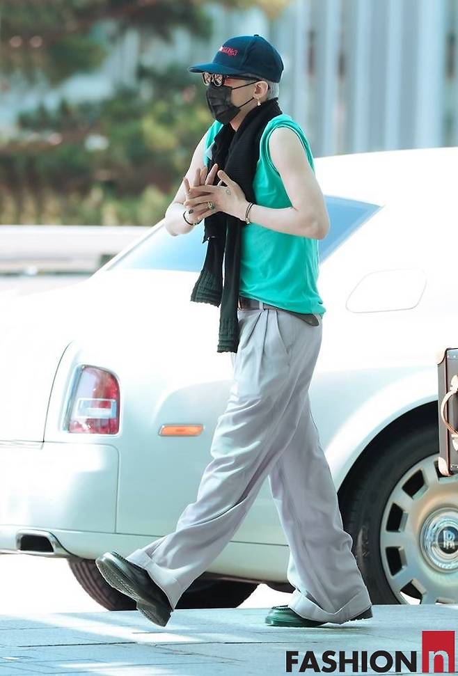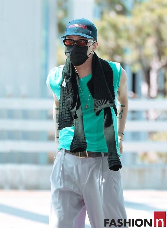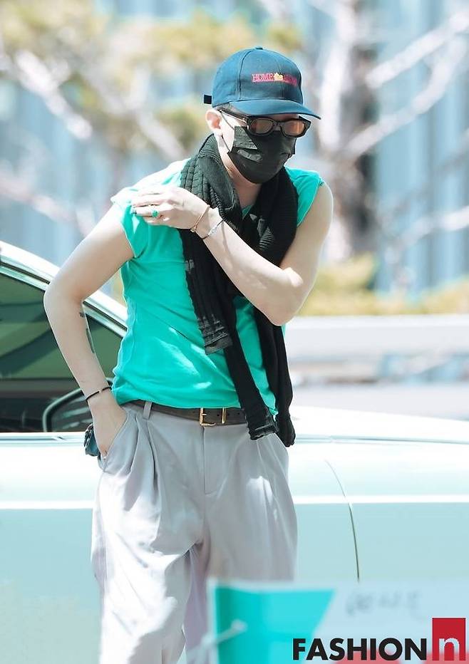 이날 지드래곤은 폭염에 맞선 그린 민소매 티셔츠와 마스크, 볼캡으로 꽁꽁 감싼 핫섬머룩으로 존재감을 발산했다.