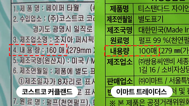 키친타월 1개당 매수는 코스트코가 160매, 트레이더스가 100매로 코스트가 더 많습니다. 키친타월 크기를 고려하지 않고 1장씩 뜯어 사용한다고 가정하면 키친타월이 상대적으로 더 오래 사용할 수 있습니다.