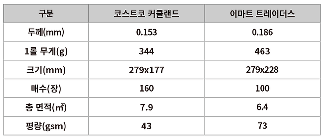 코스트코 키친타월 1롤의 무게는 344g이며, 총 면적인 7.9㎡으로 나누면 평량은 43gsm로 예상됩니다. 반면 트레이더스 키친타월 1롤의 무게는 463g으로, 총 면적 6.4㎡으로 나누면 평량은 73gsm이 예상되었습니다.