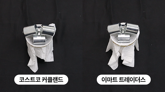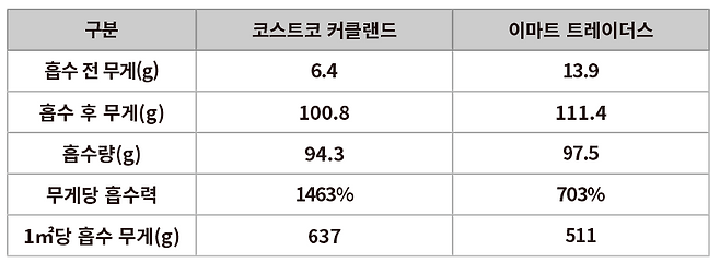 마지막으로, 같은 면적에서 얼마나 많은 물을 흡수하는지 비교해 보았는데, 1㎡당 코스트코 키친타월은 637g, 트레이더스 키친타월은 511g의 물을 흡수했습니다. 테스트해 본 결과, 두 제품 모두 다른 키친타월에 비해 흡수력이 좋았으며, 특히 코스트코 키친타월의 흡수력이 더 우수했다고 볼 수 있습니다.