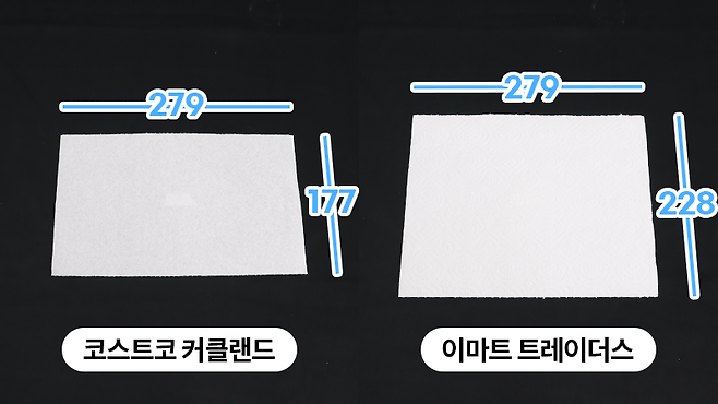 트레이더스 키친타월 한 장의 크기는 가로 279mm, 세로 228mm로 총 636㎠이었고, 코스트코 키친타월은 가로 길이가 트레이더스와 동일한 279mm이지만 세로 길이가 177mm로 약간 짧아 총 494㎠였습니다.
