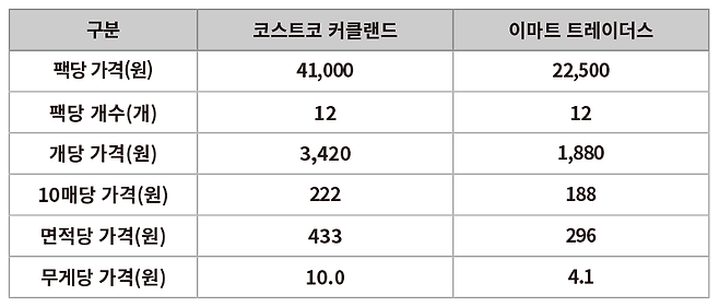 오프라인에서 1팩의 가격을 비교해 보면, 코스트코 키친타월은 41,000원이고, 트레이더스 키친타월은 22,500원입니다.