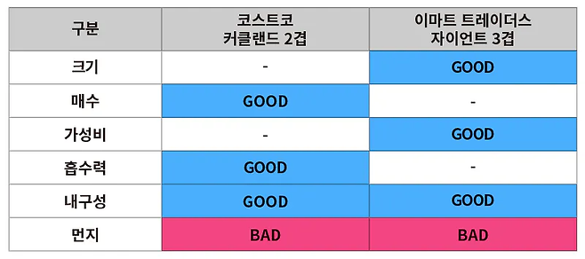 앞서 확인한 매수, 크기, 무게를 바탕으로 두 제품의 가성비를 비교해 보았습니다.