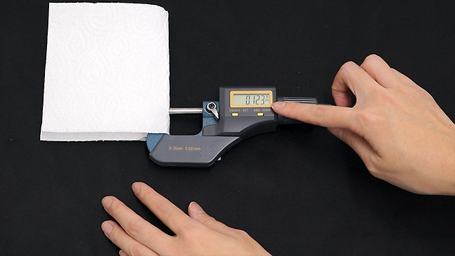 키친타월 한 장의 정확한 두께를 비교하기 위해 마이크로미터 측정기를 이용해 측정해봤습니다. 코스트코 커클랜드 키친타월의 두께는 0.153mm이고, 트레이더스 키친타월은 0.186mm로, 트레이더스 키친타월이 더 두꺼웠습니다.