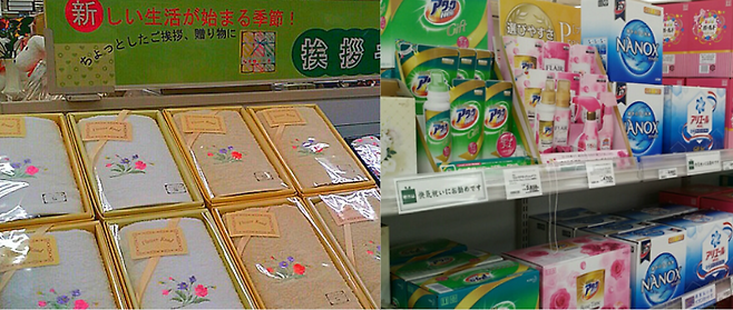한국에서는 이사를 마치고 주변 이웃에 성의를 표하고자 전통적으로 시루떡을 돌리는 풍습이 있습니다. 일본 역시 이웃에게 인사를 전하기 위한 선물을 준비하는데요. 일본에서는 수건을 선물하는 것이 일반적이라고 합니다. 쇼핑센터에서도 인사 선물 코너가 따로 마련되어 있으며 포장된 수건, 세제 등이 진열되어 있는 것을 볼 수 있죠.