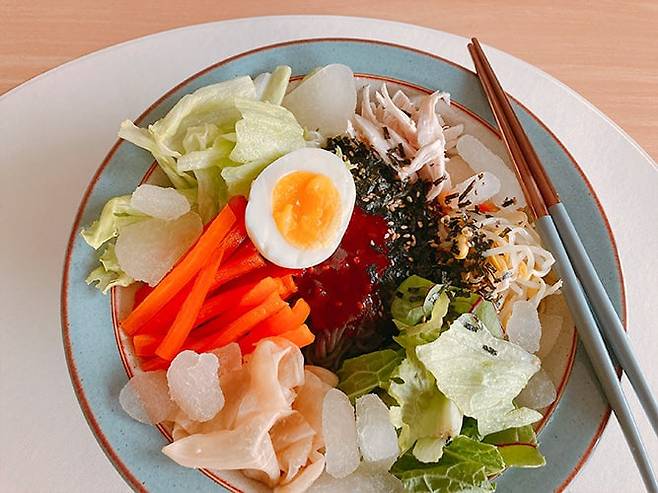 제가 특히 좋아하는 메뉴는 비빔막국수!집에 있는 재료들을 이것저것 푸짐하게 넣어 먹으니, 스트레스가 싹~ 날아가네요.