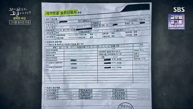 이건 계약변경 승인신청서, 보험금 수익자를 변경한다는 서류야. 이 보험의 수익자는 원래 아버지의 동거녀였어. 그런데 그게 장서희로 바뀐 거야. 그것도, 사고 보름 전에. 아버지의 동거녀는 "딸이 집요하게 날 괴롭혔다. 하루에도 전화를 수십 통 씩 하고, 우리집 문까지 따고 들어왔다"라고 말했어. 이렇게 집요하게 괴롭히니까, 결국 수익자를 장 씨로 바꿨다는 거야.