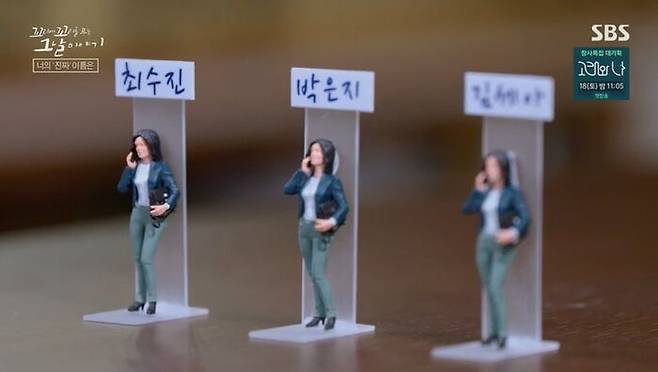 경찰이 발견한 그녀의 이름만 3개야. 수찬 씨의 예비 신부 '김세아', 준우 씨를 협박한 '박은지', 은지 씨의 명의를 도용한 '최수진'. 이 세 여자가 모두 한 사람이라는 거잖아. 그럼 이제 누구를 찾아야 할까? 바로 최수진. 형사들은 은지 씨가 알려준 정보대로, 77년생 최수진을 찾기 시작했어. 그런데 못 찾았어. 비슷한 나이대의 최수진을 전부 조사했는데, 사진 속 여성은 어디에도 없어. 그런데, 의외의 장소에서 실마리가 잡혔어.