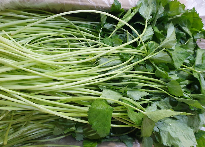 참나물은 깨끗이 씻고 물기를 제거한 후 큰 그릇에 담습니다.