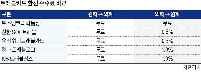 모든 트래블카드의 환전 수수료가 무료인 것은 아니다. 트래블카드로 원화를 외화로 바꿀 땐 수수료 무료가 적용된다. 그러나 남은 외화를 원화로 다시 바꿀 땐 대부분 수수료가 적용돼 주의가 필요하다. 하나은행 ‘트래블로그’, 국민은행 ‘트래블러스’ 카드는 재환전 수수료 1%가 붙는다. 신한은행 ‘쏠(SOL) 트래블’, 우리은행 ‘위비트래블’ 카드에는 수수료 0.5%가 적용된다. 농협은행의 'NH트래블리'도 수수료 0.5%가 부과된다. 일종의 환투기 방지 목적으로 수수료를 부과하고 있다는 게 은행권의 설명이다. 환테크를 노리고 달러를 샀다가 자금이 묶이는 상황까지 생길 수 있다는 뜻이다.