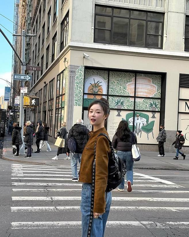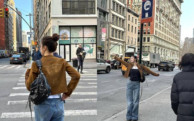 특히 재킷과 데님의 조합이 눈길을 끈다. 브라운 컬러가 주는 따뜻한 무드와 와이드 팬츠의 편안한 실루엣이 조화를 이루며 뉴욕의 자유로운 감성을 담아냈다. 여기에 미니멀한 액세서리를 더해 과하지 않으면서도 세련된 분위기를 완성했다.