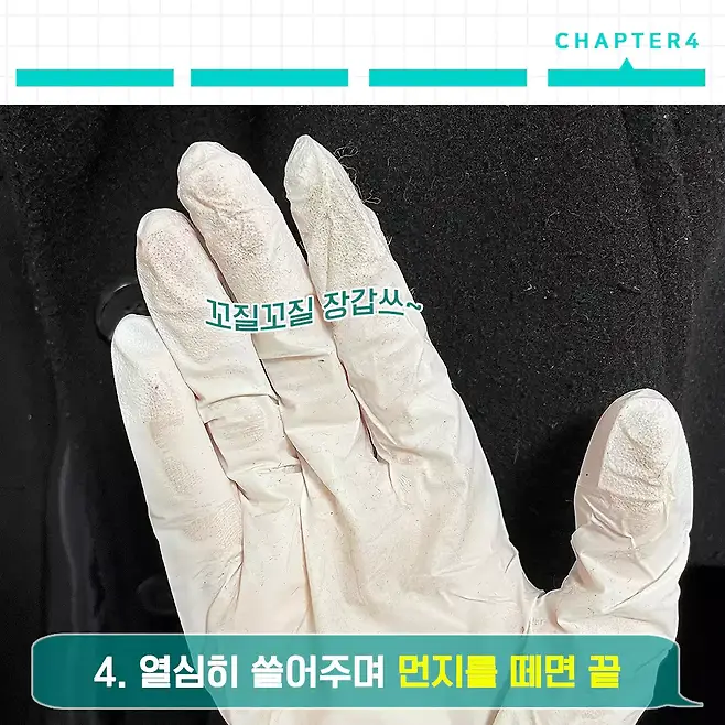 이렇게 열심히 쓰담쓰담하다보면 장갑에 먼지들이 붙어 나오는 걸 확인할 수 있어요. 장갑에 붙은 것 좀 보세요. 이게 내 옷들에 붙어 있었다고?! Oh NOooo~ 이제라도 이 방법을 알게 되어 얼마나 다행인지 몰라요.
