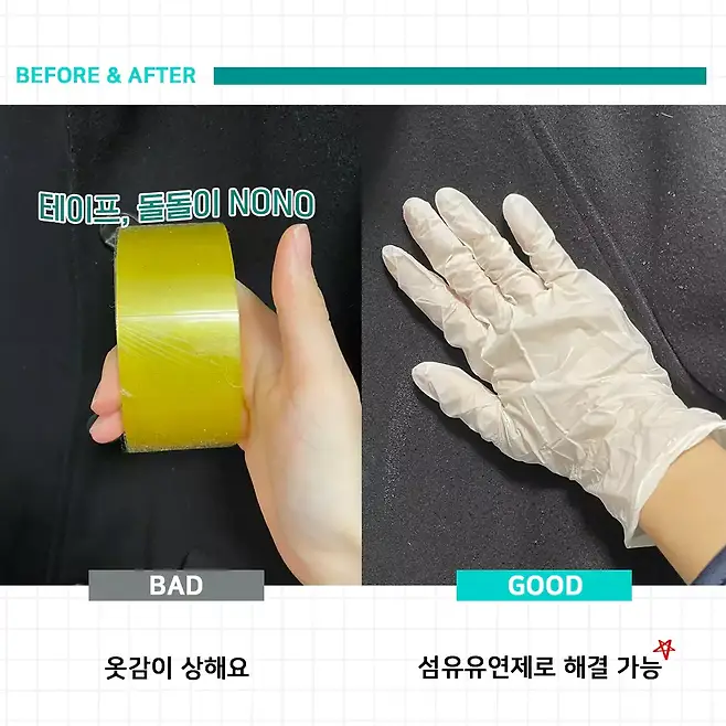 테이프로 열심히 먼지 털어내던 분들 STOP!돌돌이로 코트를 밀던 분들 STOP!강력한 접착력으로 옷감 상하게 하지 마시고, 오늘 제가 알려드린 방법 사용해보세요.