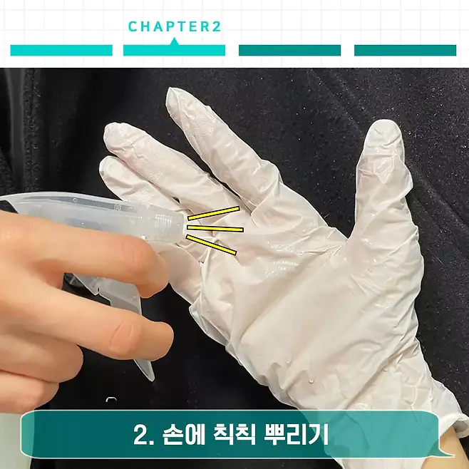 3. 장갑을 한쪽 손에 끼고 분무기를 장갑 낀 손에 뿌려주세요.