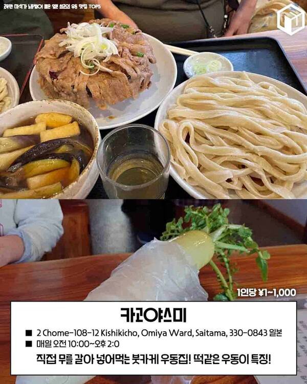 마지막으로 추천드리는 노홍철 추천 일본 우동 맛집은 일본 가와고에의 히카와 신사를 향해 이어지는 참배길 길목 어귀, 조용히 입소문을 타고 있는 작은 우동 가게인 '카고야스미'입니다. 이곳의 쫄깃한 면발과 깊은 국물 맛은 여행객들의 몸과 마음을 녹여주는 맛인데요.