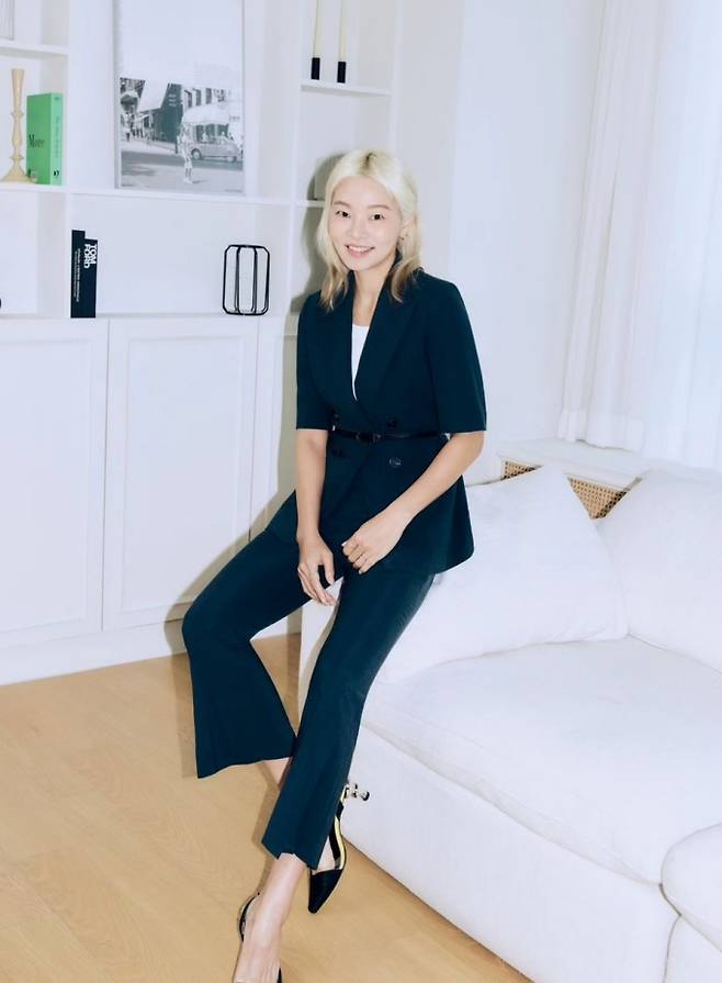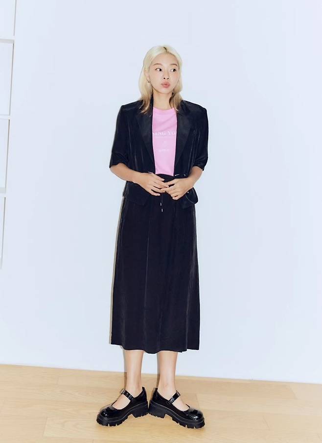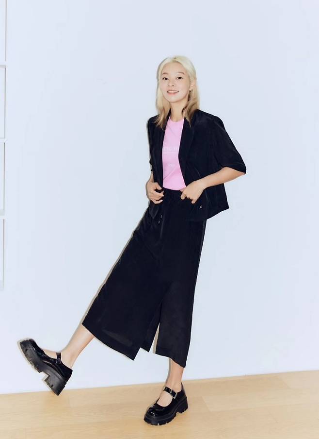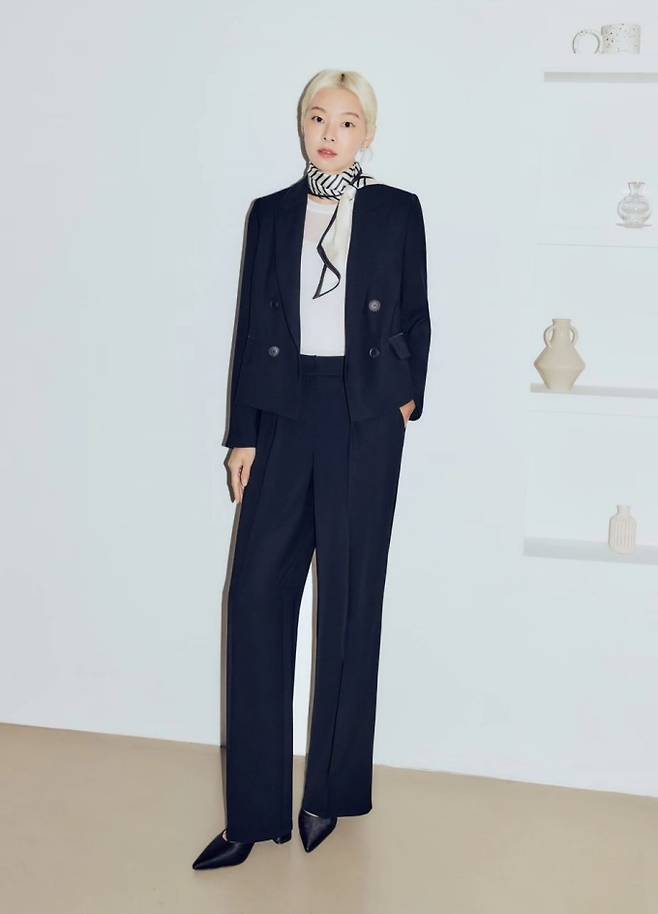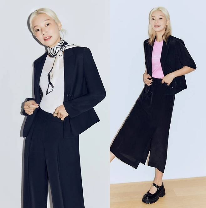 공개한 사진에서 송해나는 길이 각각 다른 블랙 팬츠에 핑크 티셔츠와 화이트 티셔츠를 입고 블랙 재킷을 걸친 파워슈트룩으로 지적인 아름다움을 과시했다.