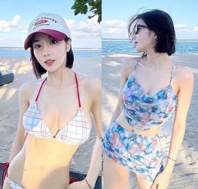 공개한 사진에서 권은비는 숏컷 헤어 스타일에 스트라이프 비키니 수영복과 화려한 블루 컬러의 비키니 수영복을 입고 탄탄한 S라인 몸매를 과시했다.