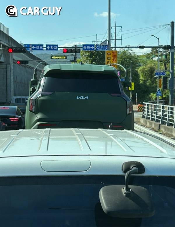 기아의 대형 전기 SUV EV9의 군용차량으로 추정되는 모델이 포착됐다. 우리 군에서 전술차량으로 기아 모하비, 쌍용 렉스턴, 렉스턴 스포츠를 사용하는 경우는 종종 있었으나 전기차가 전술차량으로 꾸며진 것은 이번이 처음이다.
